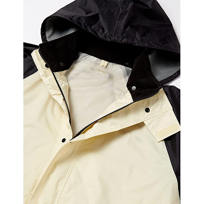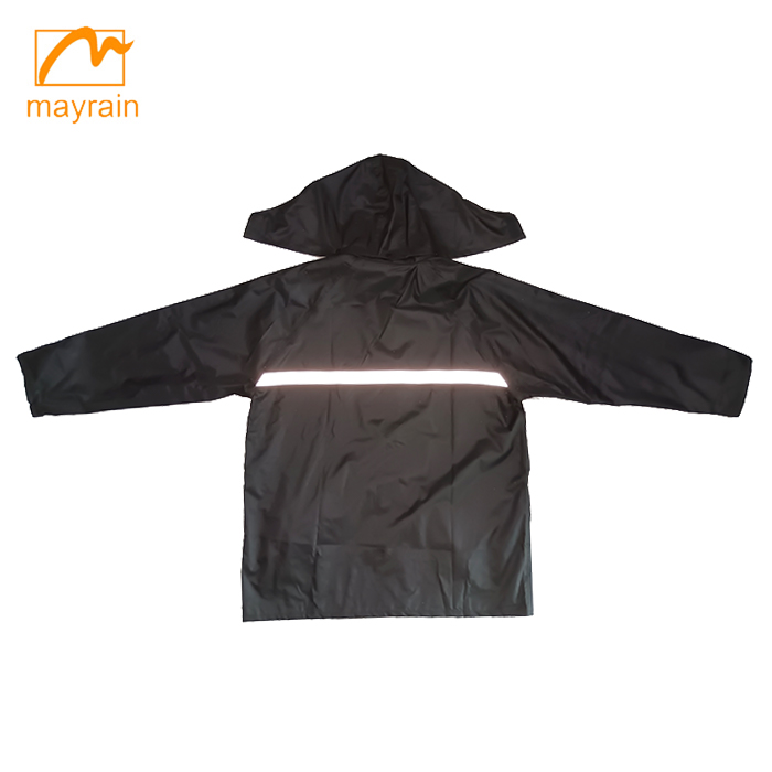 This is a very fashionable rain suit from Mayrain , the pants and jacket is the same material,and the raincoat uses two processes of sewing and coating to achieve better waterproofing. It has a hood that is attached with buttons.The front of jacket is zipper under flap, there are four snaps on flap, Resin Zipper is Smooth and firm.The front of the raincoat has two pockets, you can put your electronics inside without worrying about getting water. And there are reflective strips on the chest and back of the raincoat to ensure your safety in the dark of night.And the waist of the pants is adjustable elastic, its fabric is polyester/pvc coating, the lining is breathable mesh, so this rain suit is very comfortable to wear.
