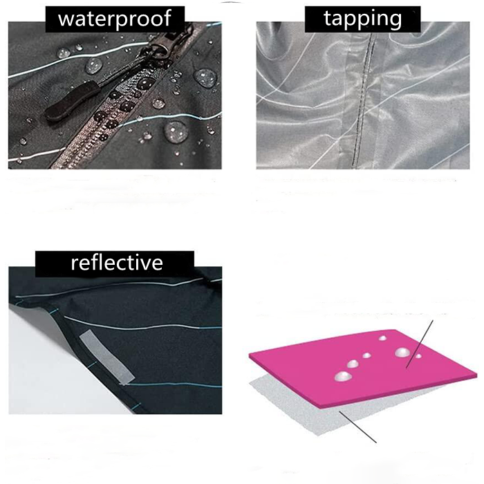 Polyurethane coating has both waterproof protection and breathable function. If you touch the fabric, it feels like a film on the surface. Polyester polyurethane coated fabrics are mainly used in outdoor clothing and military industry. They have the characteristics of air permeability, wear resistance, wind resistance and softness. As we all know, polyester is made from petroleum. If you are concerned about the environment, we can also provide you with recycled PET fabric. Its biggest selling point is that it's a riding poncho, and it comes with an elastic rope on the inside that attaches to the handlebars of the bike, which is very stable. And the poncho is waterproof and windproof,