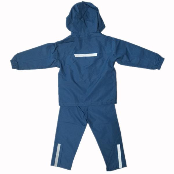 Design:For the jacket and pants choose polyester with waterproof coatedfabric,this fabric is Eco -friendly material.We not only supply the the rainwears,we more care the safe foro ur children.Af first,we choose the reflector on the jacket and pants.Another,there is the elastic hood cord,it is not easy to cause damage for our children.Also there is the elastic brand on the cuff,velcro on the leg open to adjust the size.